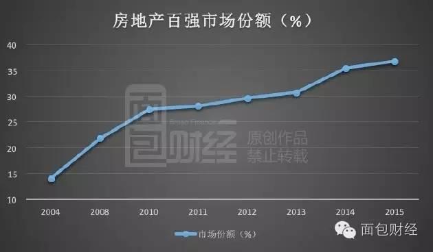 房地产百强的市场份额,从2004年的约14%增加到2015年的36.7%。在房价经历剧烈调整的2014和2015年,这种集中的趋势更加明显,2015年百强的市场份额比2013年提高了6个百分点。